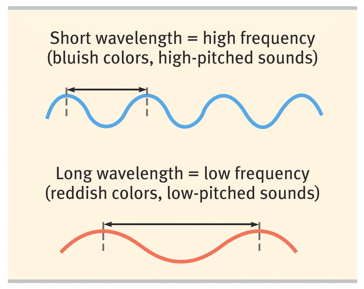 - Wavelength: distance between peak of one wavelength to next
