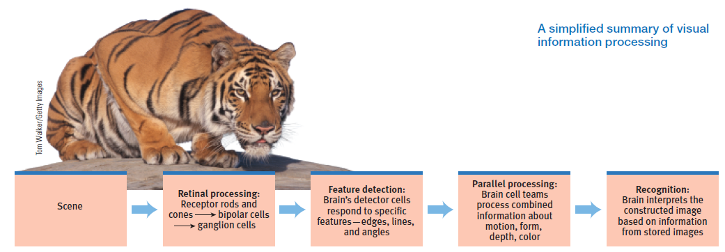 - Bottom up processing (sensation): analysis of the stimulus begins with sense receptors → brain