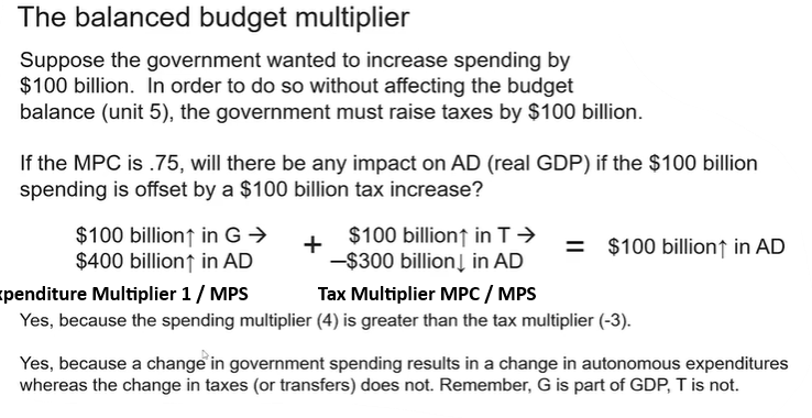The tax multiplier is linked to the spending multiplier through the MPC. due to the tax multiplier always being negative and 1 less than the spending multiplier, or when subtracted will equal 1