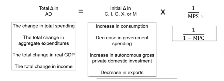 Example: When investment increases by $1, income increases by a maximum of $5, if MPC is 0.8. Because investment spending is part of AD, so a $5 increase in AD, which is equal to aggregate expenditure, which is equal to aggregate income.