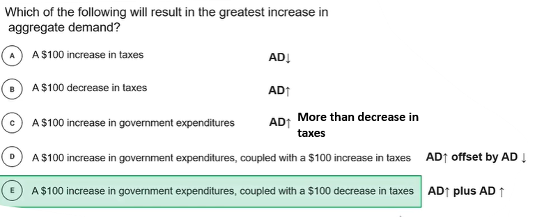 The tax multiplier measures the impact of changes in taxation on aggregate demand; for instance, if taxes decrease, disposable income rises, leading to increased consumption and thus a positive effect on AD.