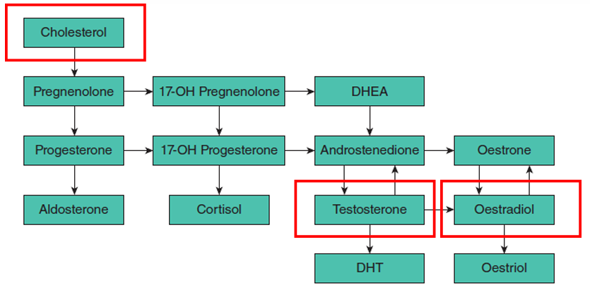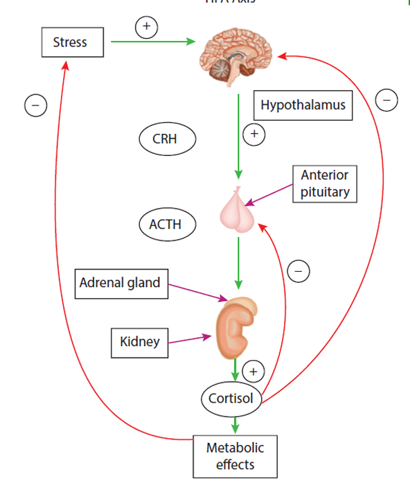 hypothalamus —CRH→ anterior pituitary —ACTH→ adrenal cortex → CORTISOL!!!!