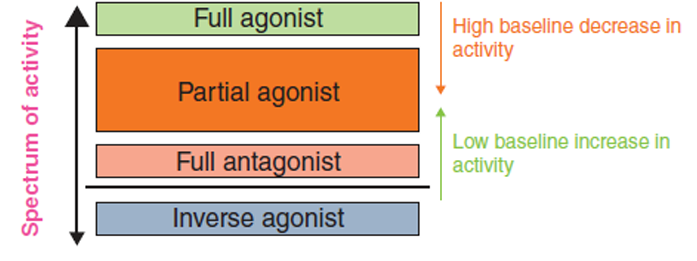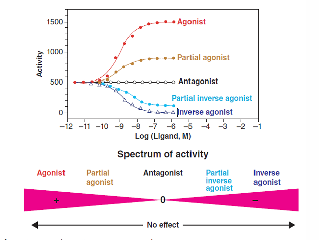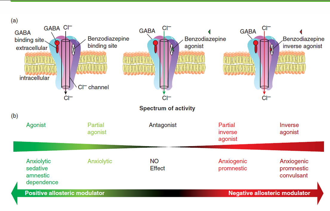 Indirect impact at the GABA receptor via the benzodiazepine binding site, by various drugs: effects can be positive (agonist) facilitating activity or negative (inverse agonist) inhibiting activity