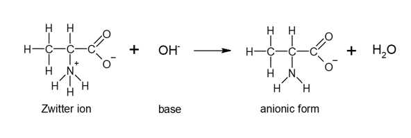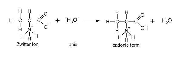 Protons move from the OH group in the COOH group and join the NH2 group to form a Zwitterion which looks like this.