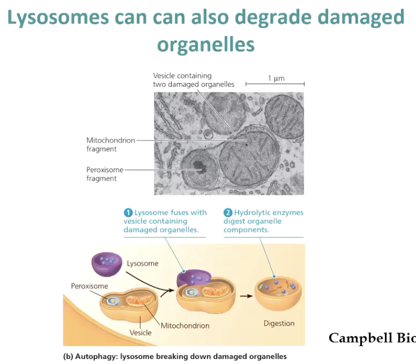 Lysosomes function in acidic conditions (pH 4.5-5.0) and house various hydrolytic enzymes (nucleases, proteases, lipases, glycosidases).