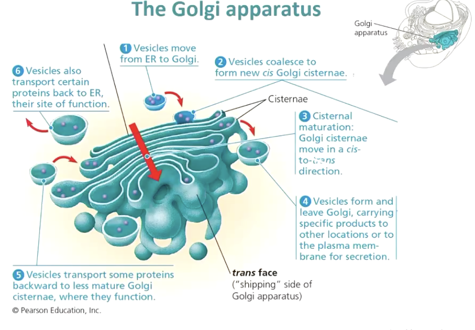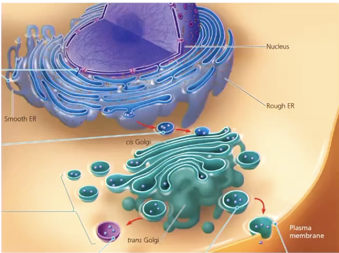 Trans Face: The shipping side where vesicles bud off, carrying products to different destinations, including the plasma membrane for secretion.
