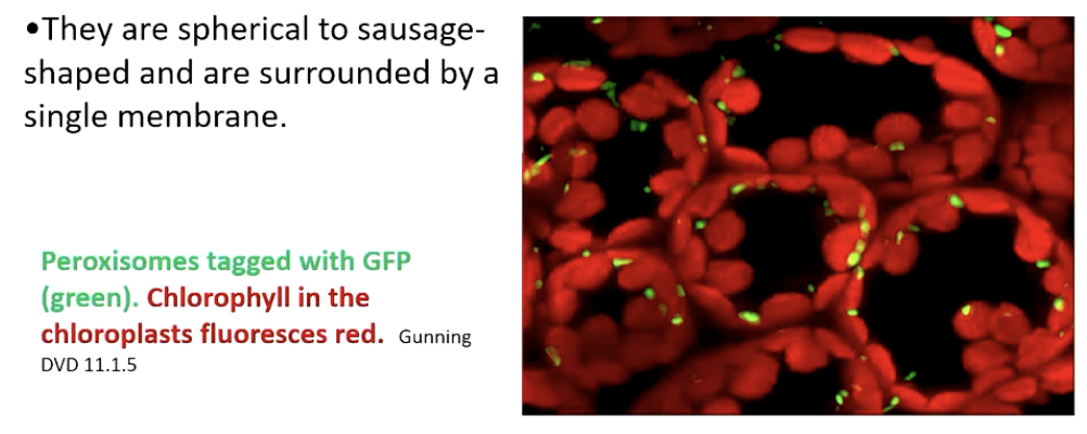 Characteristics: Spherical to sausage-shaped, surrounded by a single membrane, contain oxidative enzymes that generate hydrogen peroxide during reactions.