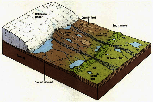 Glacial till/drift: unsorted glacial sediment, types of debris include outwash, sorted, stratified, rockflour