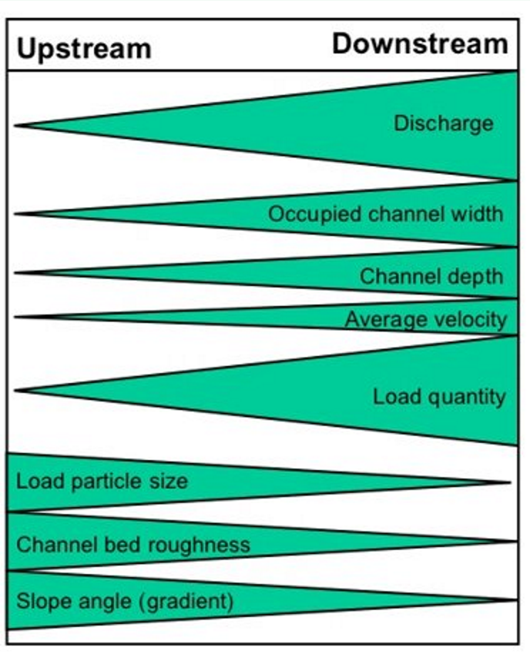 Hydraulic radius - Increases downstream - this is the efficiency of the river. As the river moves downstream there is less friction as the channel bed roughness has reduced and the river can flow more quickly and efficiently