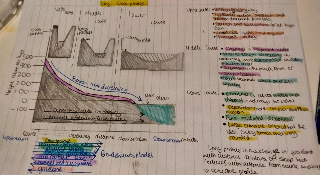 Channel depth - Greater discharge causes vertical erosion (hydraulic action and abrasion) to deepen the river, but not by much as the river is flowing close to sea level