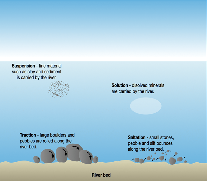 Solution load - The transport of dissolved chemicals. This varies along the river depending on the presence of soluble rocks