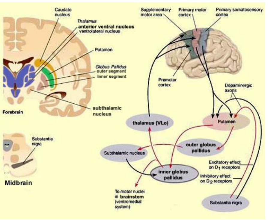 Cortex - straitum - globus pallidus - VLo - cortex (supplementary motor area, or SMA)