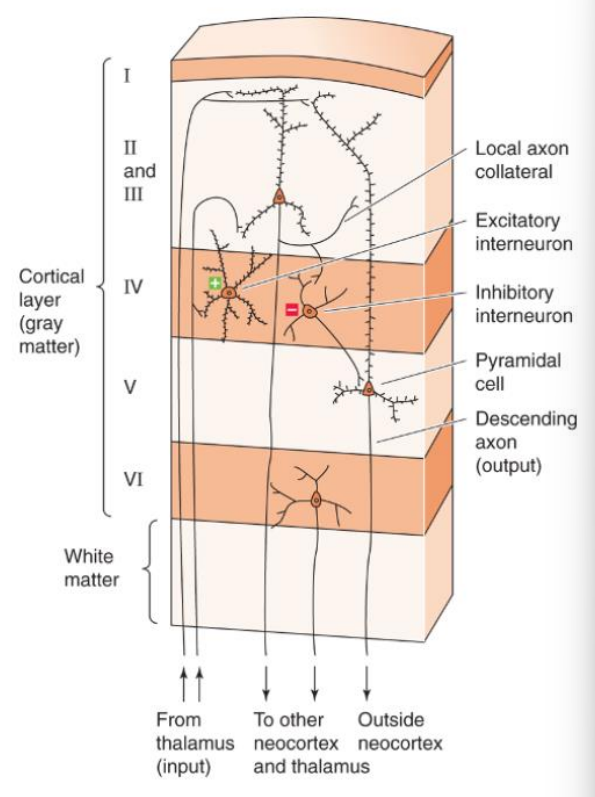 axon synapse on both inhibitory + excitatory interneurons in the spinal cord