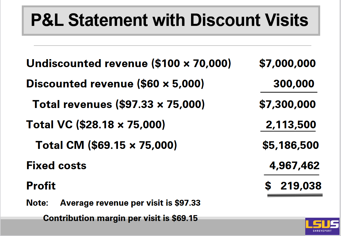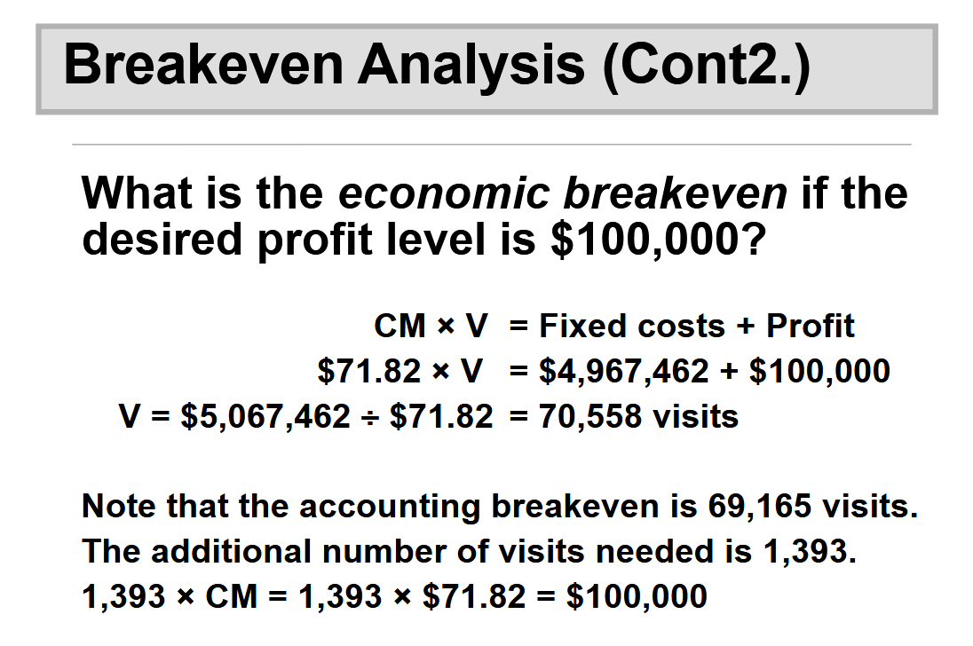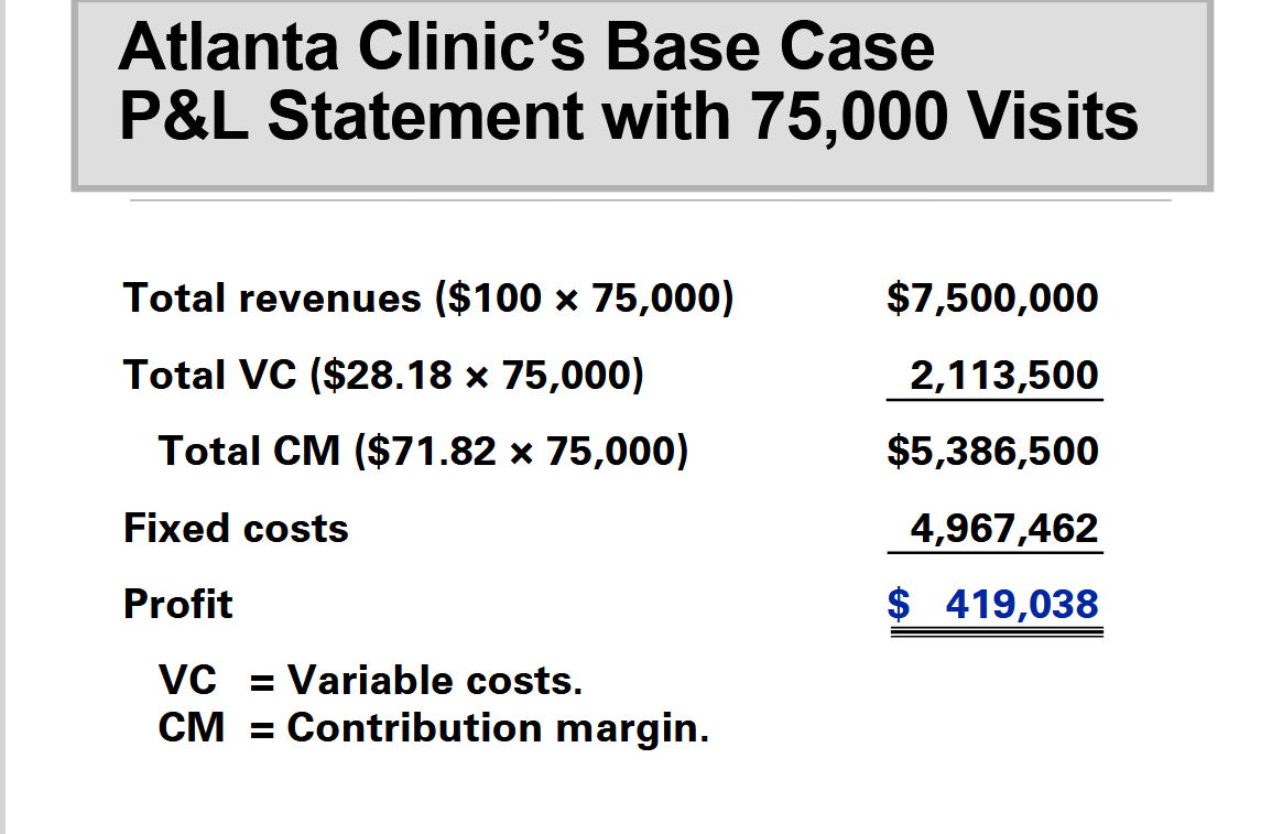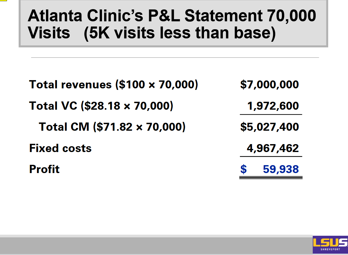 Example: In the case of the Atlanta clinic, the contribution margin is $100 − $28.18 = $71.82.