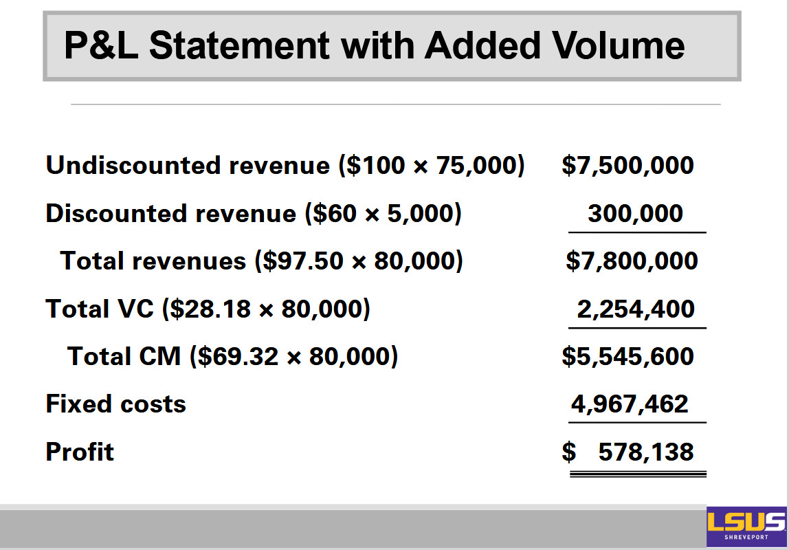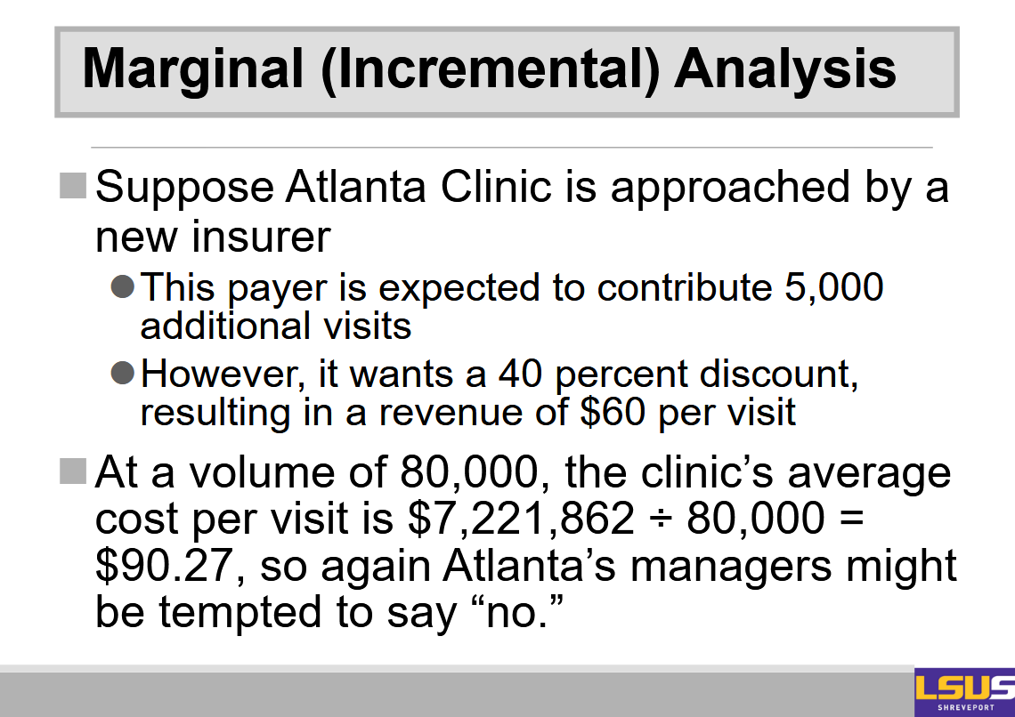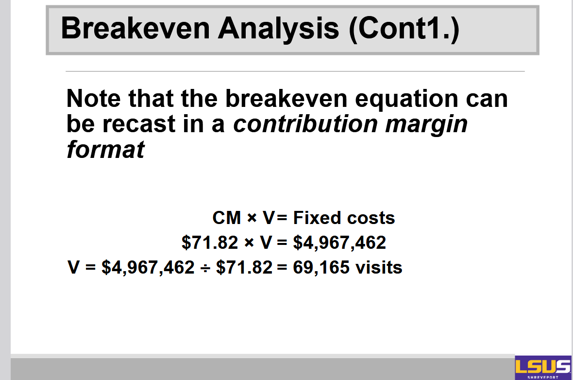 Example: In the case of the Atlanta clinic, the contribution margin is $100 − $28.18 = $71.82.