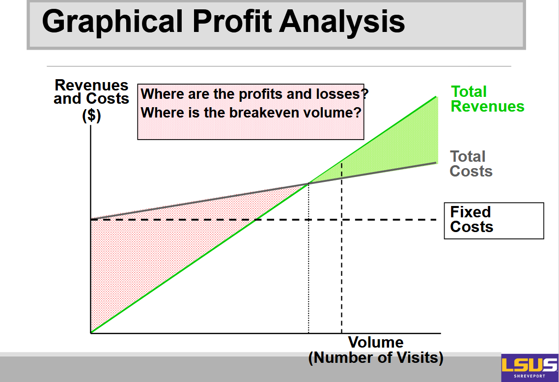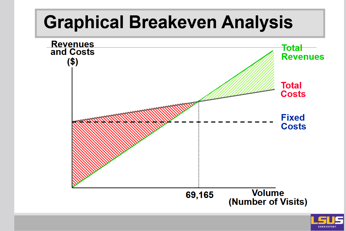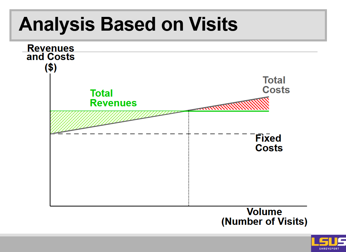 On the x-axis you have volume or number of visits, and on the y-axis you have cost. Then there are three lines. You have the total variable cost line, you have the fixed cost, and then you have the total cost line.