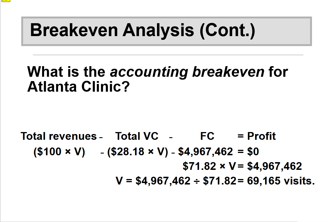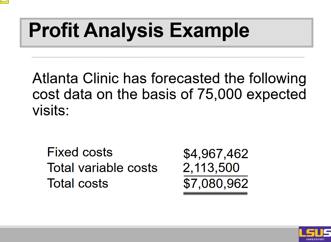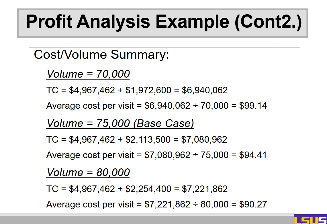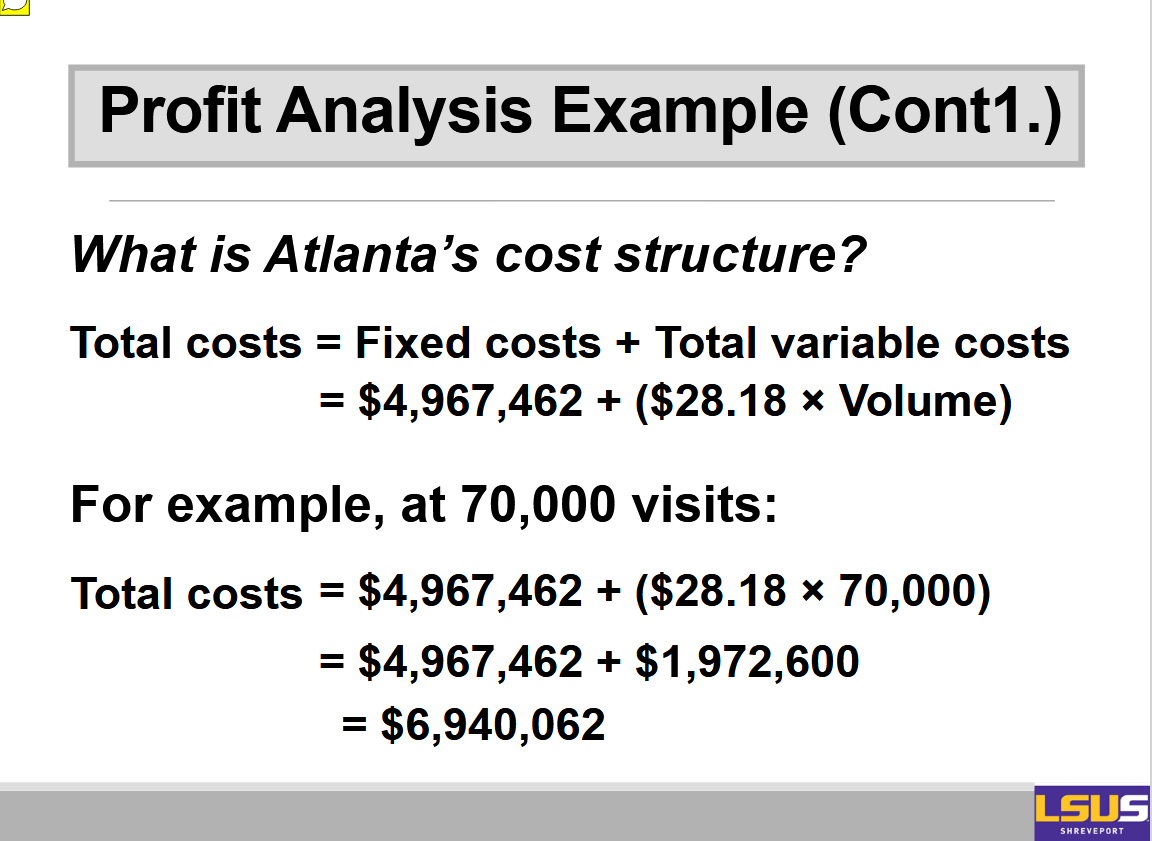 On the x-axis you have volume or number of visits, and on the y-axis you have cost. Then there are three lines. You have the total variable cost line, you have the fixed cost, and then you have the total cost line.