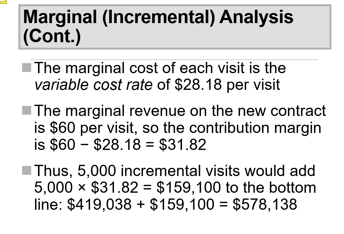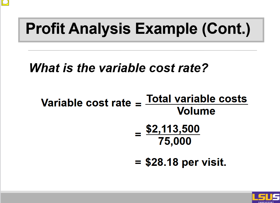 The contribution margin - Difference between per visit (unit) revenue and the variable cost rate.
