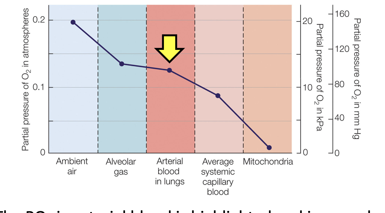 higher po2 in arteries (away from heart) means more effective gas exchange