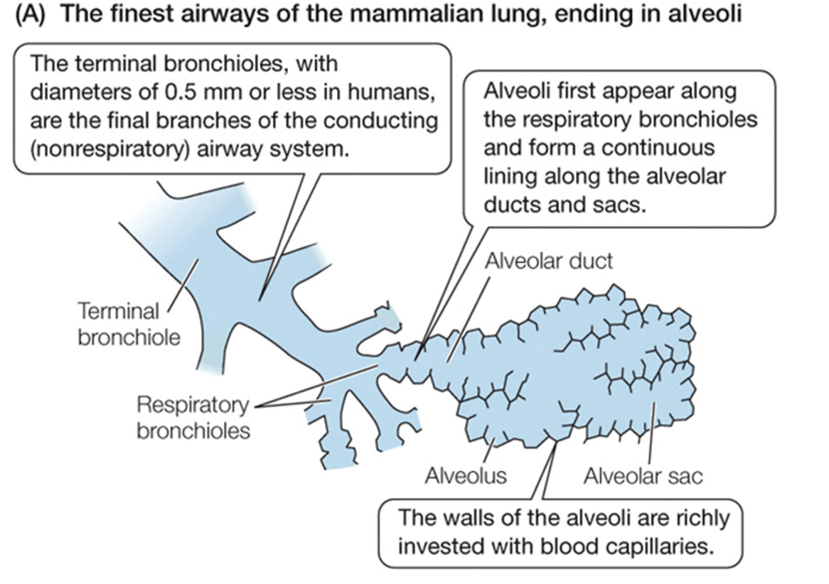 at the end of the branches there are alveolar ducts and sacs and the walls of the structures are called alveoli