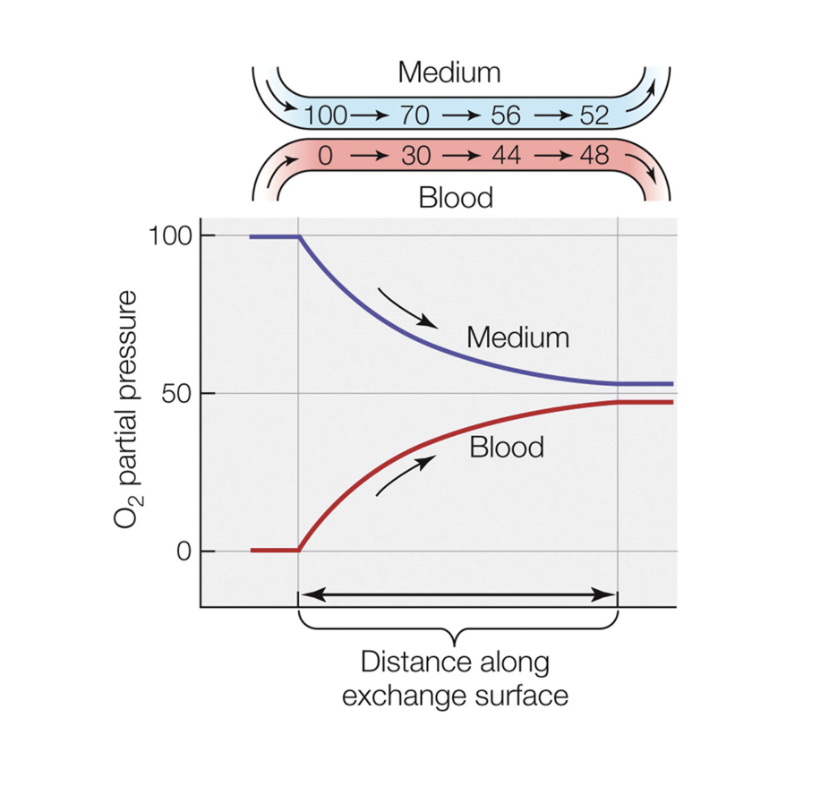 for example water enters at a high o2 concentration and the blood heading to gils have a low o2 so they diffuse but as they move along the gradient is being loss so no more o2 can difuse into the blood