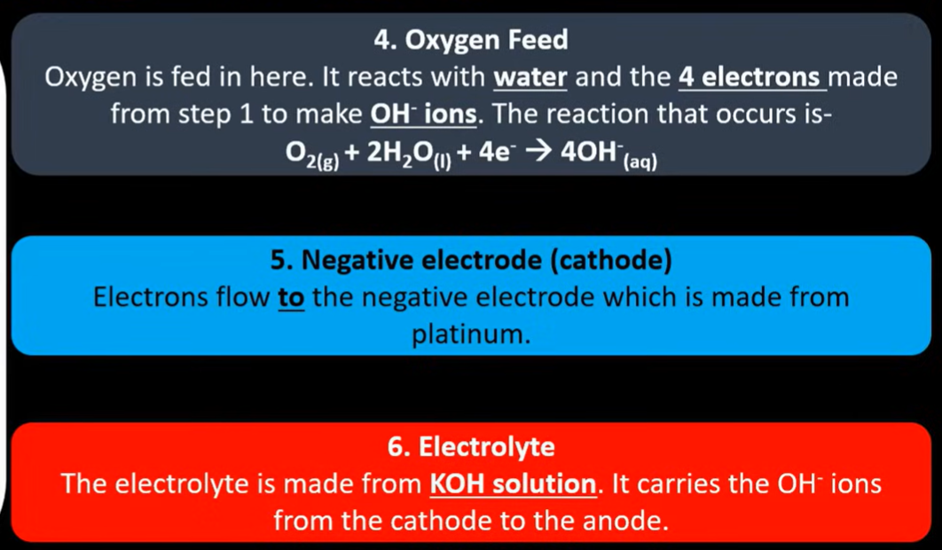 Hydroxide ions travel to the negative electrode where ions combine to form water molecules