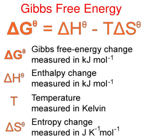 Gibbs free energy: combines the entropy and enthalpy (if negative reaction is feasible)