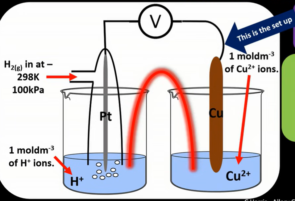 Where Hydrogen gas is bubbled into a solution containing H+ ions, since hydrogen doesn’t conduct, electrical contact is made from platinium rod (finely coated to increase surface area)
