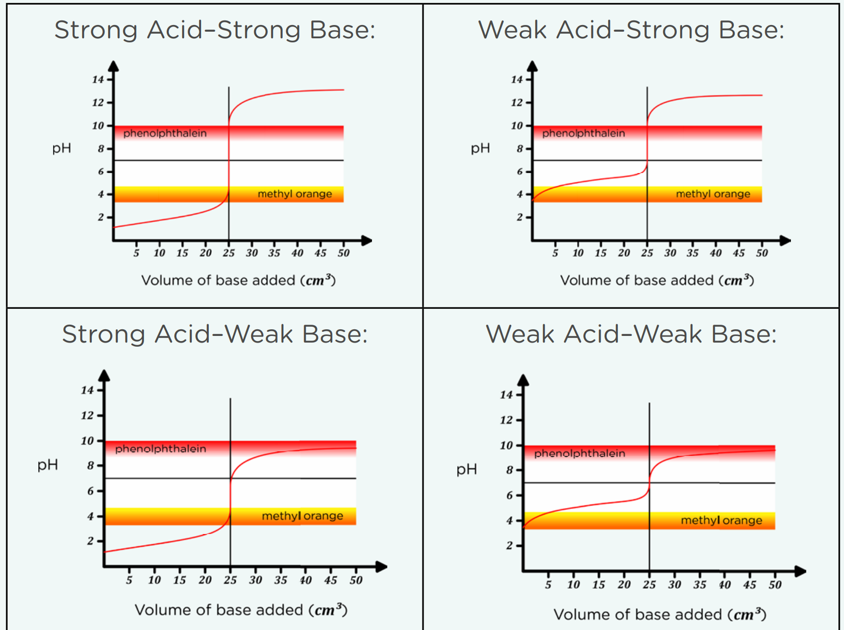 Phenolthalein: colourless (acid) —> pink (alkaline)