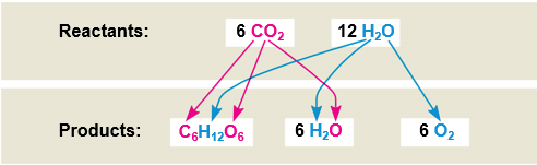 6 CO2 + 12 H20 + Light Energy → C6H12O6 + 6 O2 + 6 H2O - The chemical equation for photosynthesis