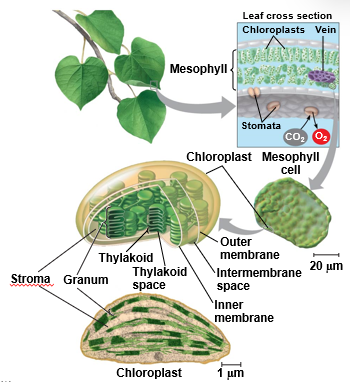Mesophyll - It’s the interior tissue of the leaf. Chloroplasts are found mainly in the cells here.