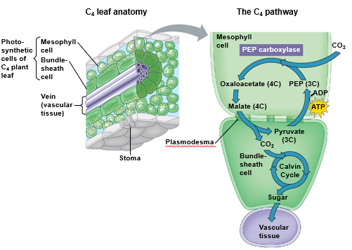 Production of Four-Carbon Precursors in Mesophyll, Exported to Bundle-Sheath Cells, Bundle-Sheath Cells Release CO2 to be used in the Calvin Cycle - The three-step process of sugar production in C4 plants.