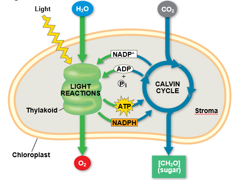 ATP, NADPH - The Calvin Cycle in the stroma forms sugar into CO2 using?