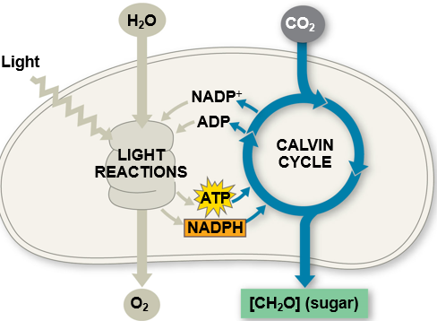 (True) Light reactions generate ATP and increase the potential energy of electrons by moving them from H2O to NADPH.