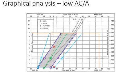 low AC/A (insufficiency) don’t respond well to plus or minus → generally require prism (BO)