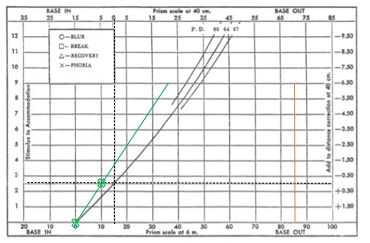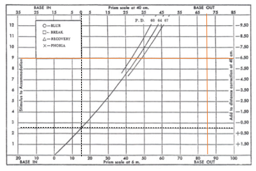 Vertical dotted line at 15 Δ BO (convergence demand at 40 cm with PD = 60 mm, i.e., 6.0/0.40 = 15 Δ).