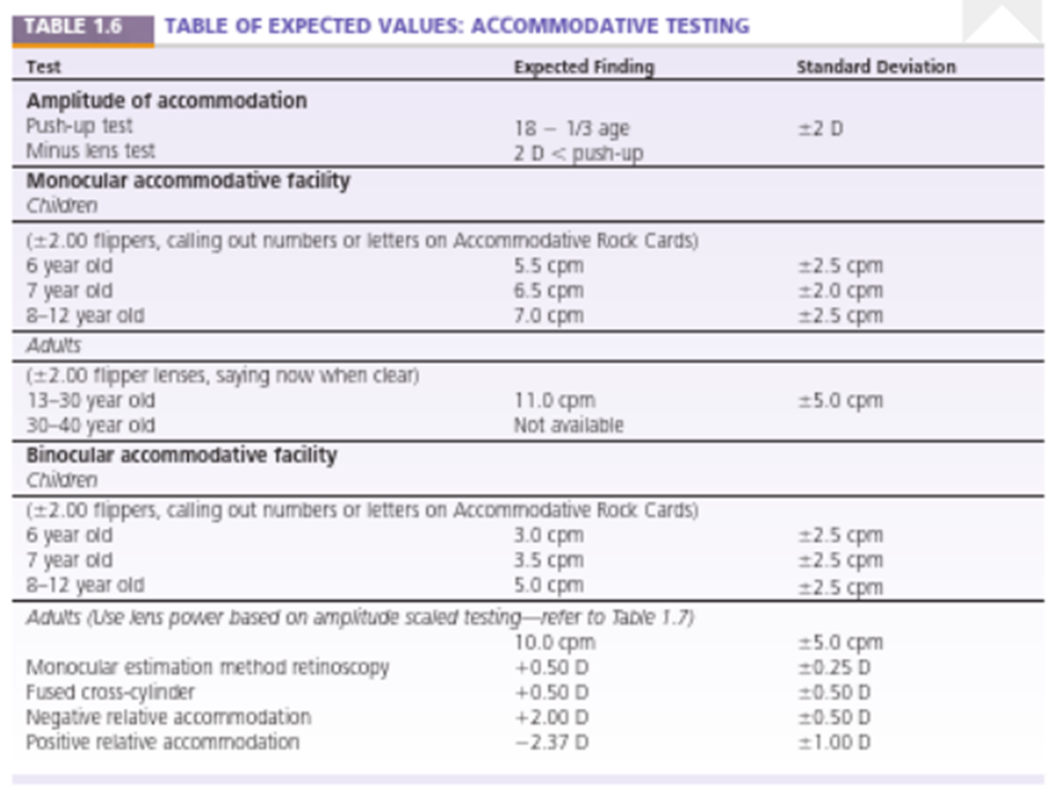 Normal: +0.25 to +0.50 D for a 2.50 D stimulus