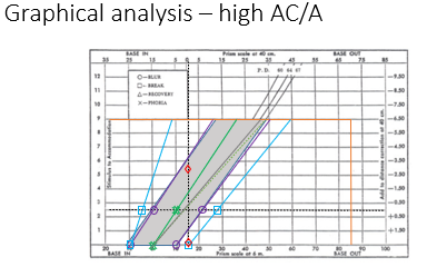 High AC/A: larger vergence change per diopter of accommodation; potential for convergence excess or accommodative problems influencing vergence.