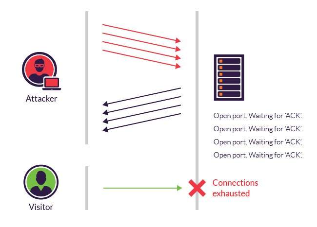 - An attacker spoofs their IP address and sends a multitude of SYN packets, never allowing the server the space in its memory to respond and attempt to complete the three-way handshake