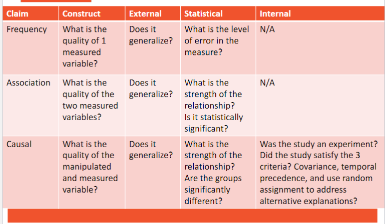 o Construct-How accurately/appropriately did a researcher operationalize each variable