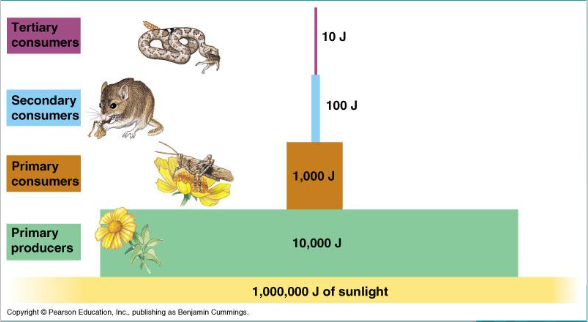 As energey passes along the food chain, it deacreases due to energy loss from the transfer from one organism to the next