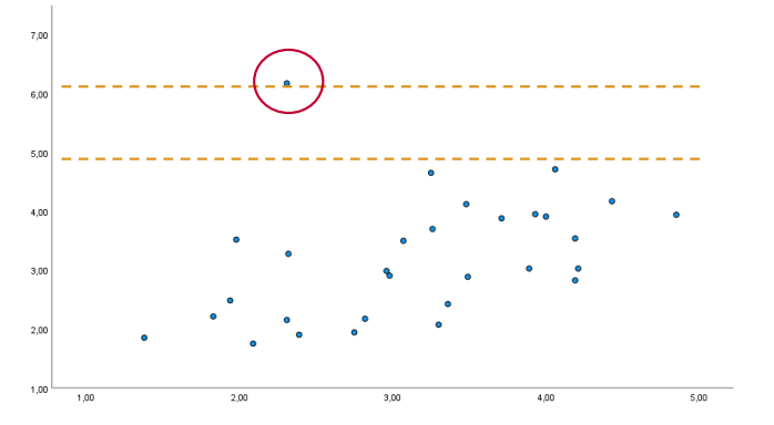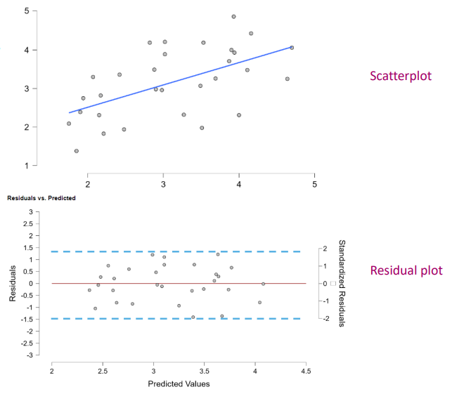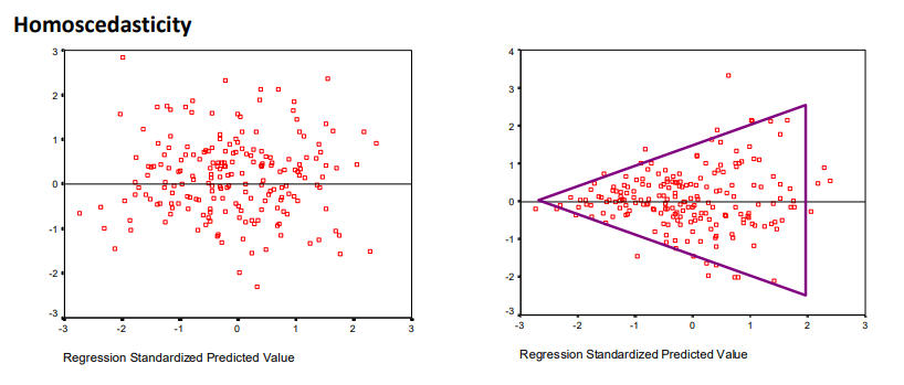 Homoscedasticity - equal variance of all predicted scores → residuals should be evenly distributed along the line e = 0