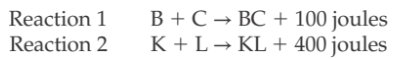 The bond formed in Reaction 2 is more stable than the bond formed in Reaction 1. It takes 400 joules to break apart Compound KL, but only 100 joules to break apart compound BC.'