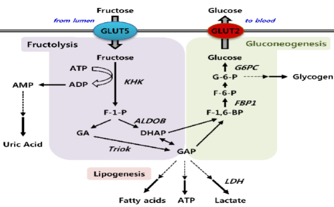 utilisation of fructose bypasses PFK1 → enhance fatty acid production