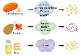 Examples include amylase, maltase, lactase, lipase, pepsin, and trypsin, peptidase.