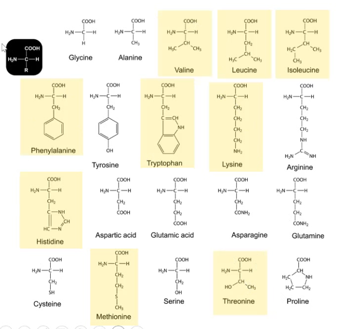 Examples of essential amino acids are highlighted in yellow in the diagram.