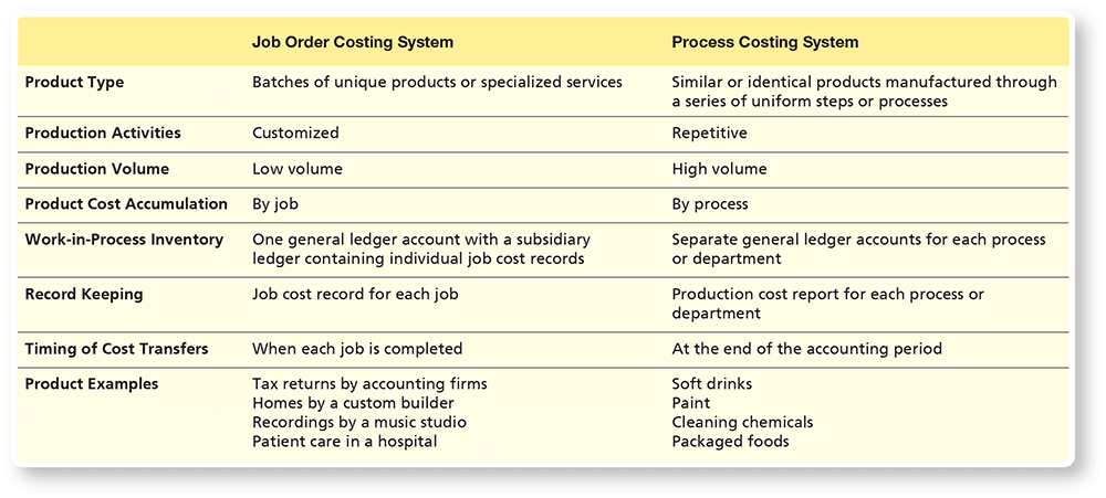 Process costing utilizes repetitive production activities while a job order cost system relies on customized production activities. In a job order costing system, the timing of cost transfers happens when each job is completed as opposed to process costing where cost transfers happen at the end of an accounting period.
