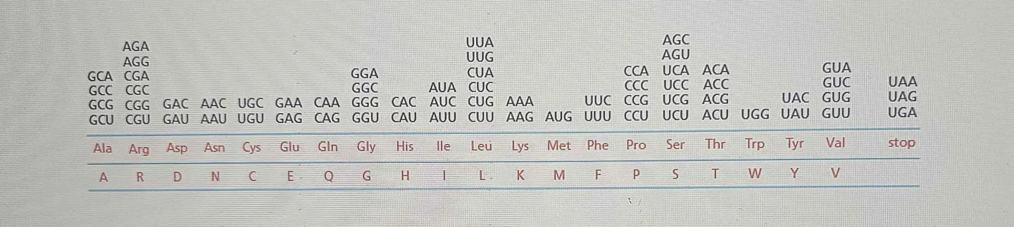 Example: GCU, GCC, GCA, and GCG all code for Alanine (Ala).