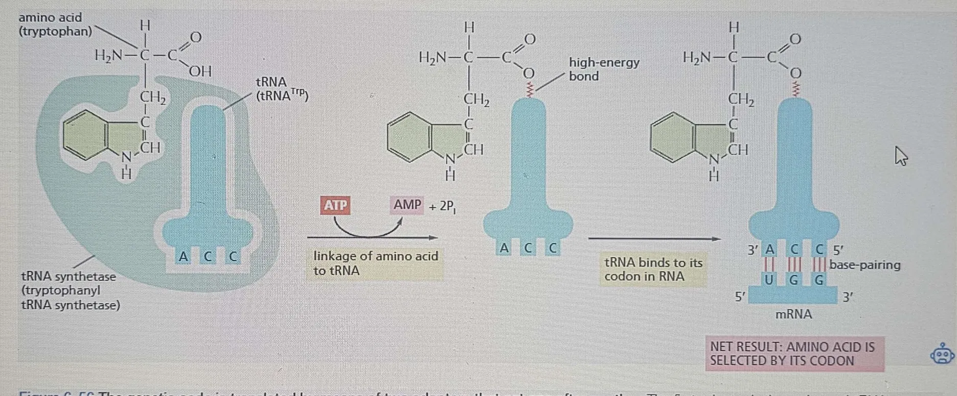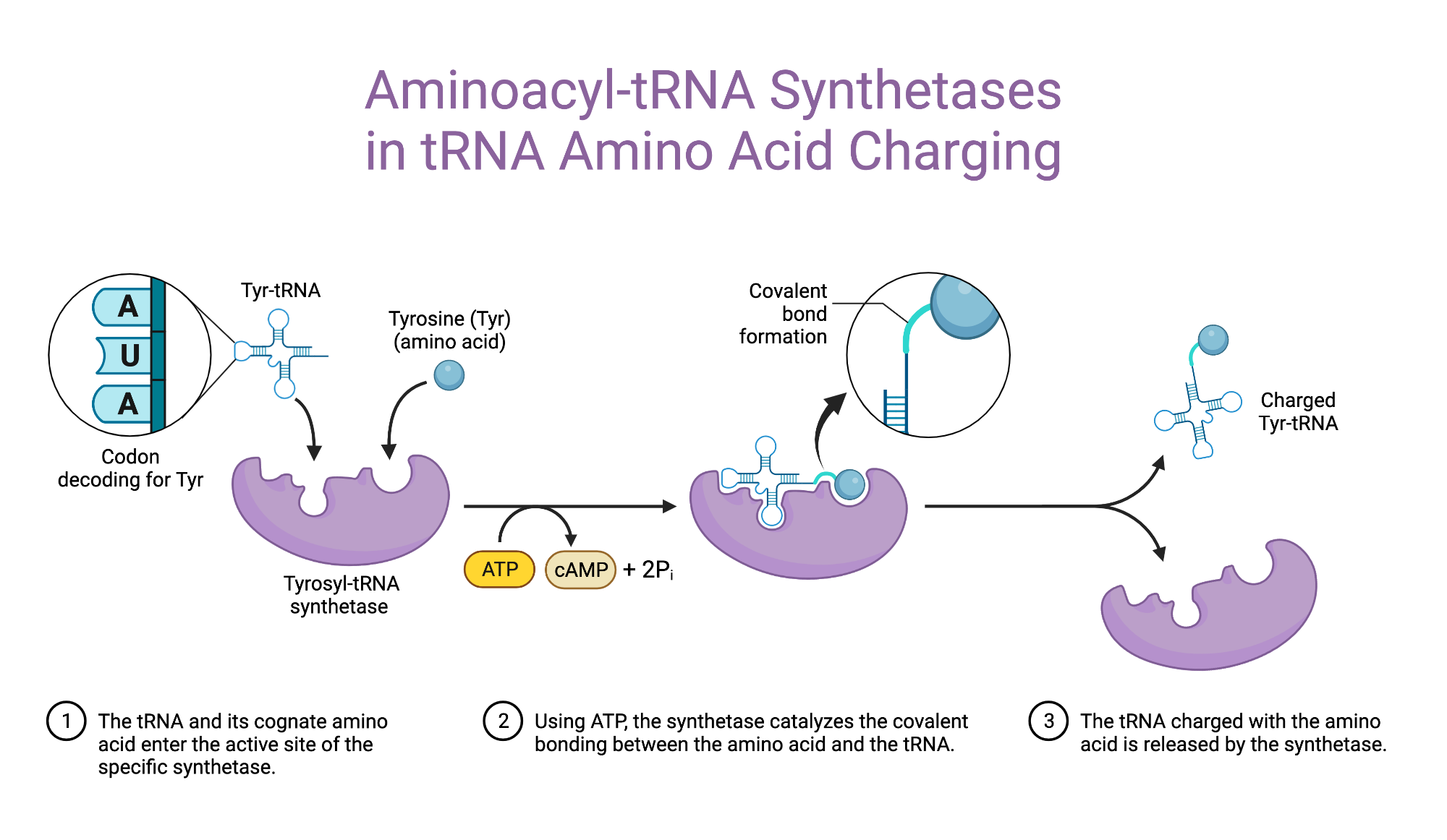Amino Acid Attachment Site: At the 3' end of the tRNA, where a specific amino acid is covalently attached by an enzyme called aminoacyl-tRNA synthetase (which ensures the correct pairing).