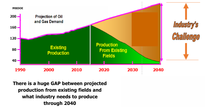The huge GAP between projected production from existing fields and what industry needs to produce through 2040 can be filled in three ways;